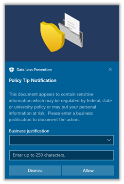 In order to ensure the protection of sensitive information, certain actions will cause a Data Loss Prevention pop-up window to appear: