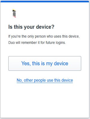 Choose Yes, this is my device to create a trusted device session that will let you skip Duo two-factor authentication when you log in again with the same browser and device until that remembered device session expires in 7 days.