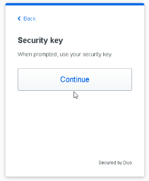 A security key is an external device that when tapped or when the button is pressed sends a signed response back to Duo to validate your login. Duo uses the WebAuthn authentication standard to interact with your security keys. You may also see WebAuthn referred to as "FIDO2".To use a security key with Duo, make sure you have the following: