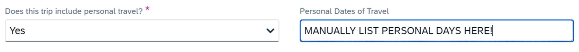 When personal travel will be included, this must be indicated on the report header of the Travel Authorization Request (TAR) in the fields shown below: