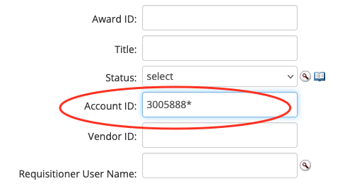 In the Account ID field of the search window, enter the Quantum Award ID with an asterisk. The results should contain all subawards that were issued with either the Quantum Award ID or any related PID.
