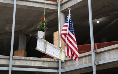 The ceremonial topping-off ceremony marks a new stage in the construction of the building at the corner of Martin Luther King Jr. Boulevard and Baltimore Street.