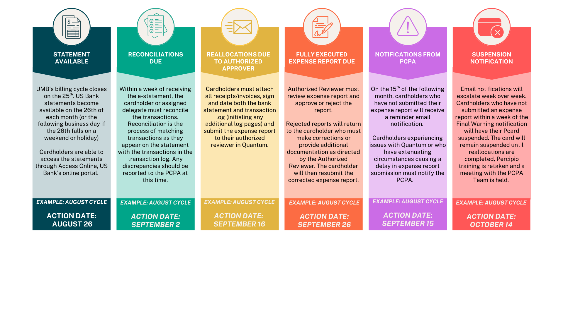 This infographic demonstrates the timeline of a PCard expense report.