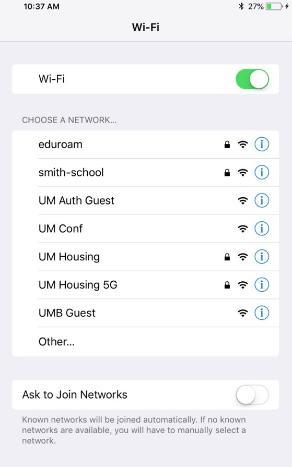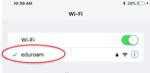 At the Wi-Fi settings ON-OFF switch, select ON, then select eduroam from the list of available wireless networks.