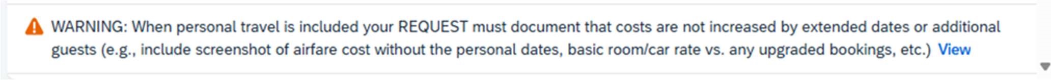 If personal travel was included, this must be indicated on the report header of the Travel Expense Report. Concur will then display a warning on necessary cost reductions: