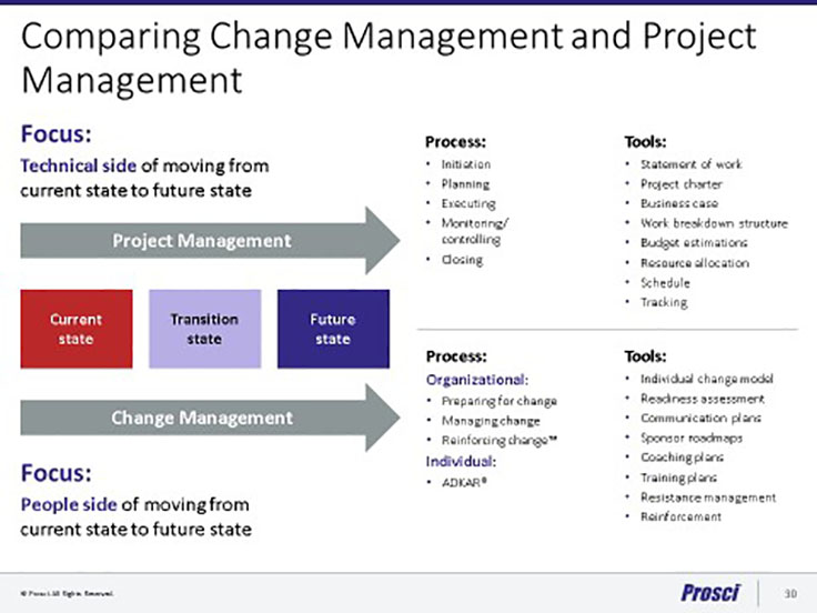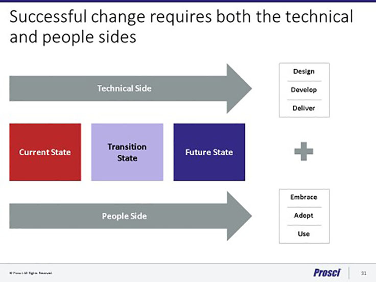 In their book, Change Management, The People Side of Change, Jeffrey Hiatt and Timothy Creasey, CEO and chief development officer of Prosci, respectively, write that “change Management is the application of processes and tools to manage the people side of change from a current state to a new future state so that the desired results of the change and expected return on investment are achieved.”