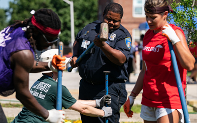 Volunteers come together for cool experience in record heat to build new playground at Eutaw-Marshburn Elementary School.