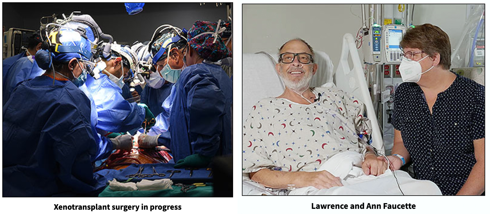 The first historic surgery, performed in January 2022, was conducted on David Bennett by University of Maryland Medicine surgeons (comprising UMSOM and UMMC), who are recognized as the leaders in cardiac xenotransplantation. This new patient, Lawrence Faucette, had end-stage heart disease. He was deemed ineligible for a traditional transplant with a human heart, by UMMC and several other leading transplant hospitals, due to his pre-existing peripheral vascular disease and complications with internal bleeding.