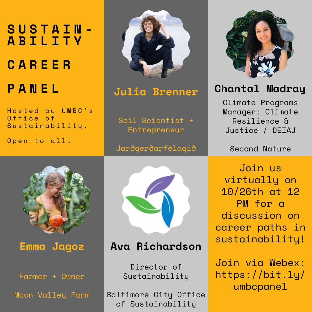 - View the flyer here: UMBC Sustainability Career Panel Flyer