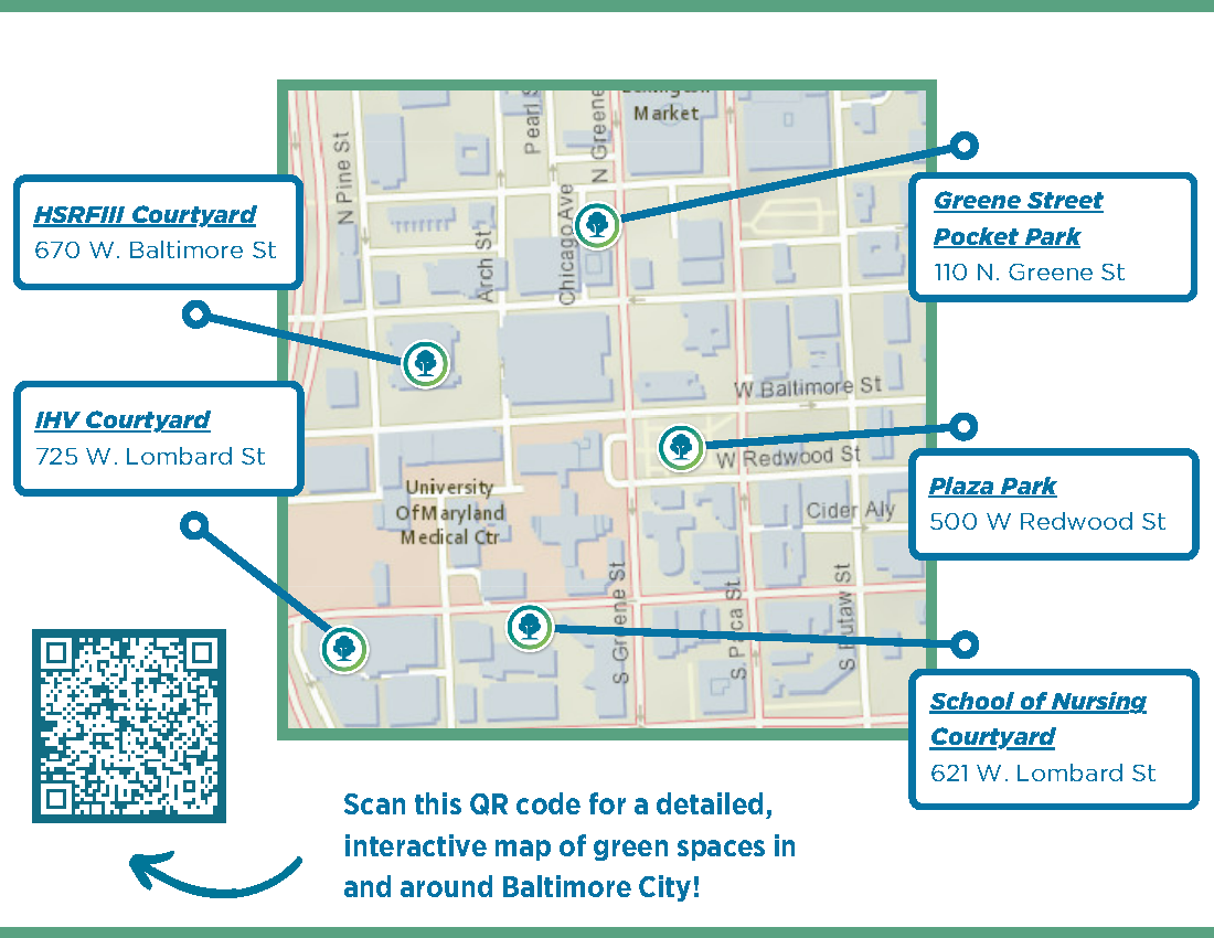 To see UMB’s green spaces, Baltimore City Parks, and Maryland State Parks, visit UMB’s Green Spaces Map.